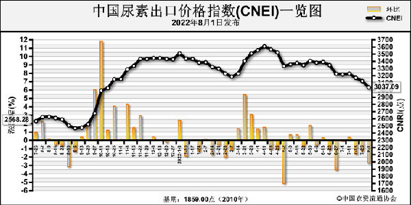 8月1日中國尿素出口價格指數(CNEI)為3037.09點,環比下跌88.96點,跌幅為2.85%;同比上漲412.85點,漲幅為15.73%;比基期上漲1178.09點,漲幅為63.37%。